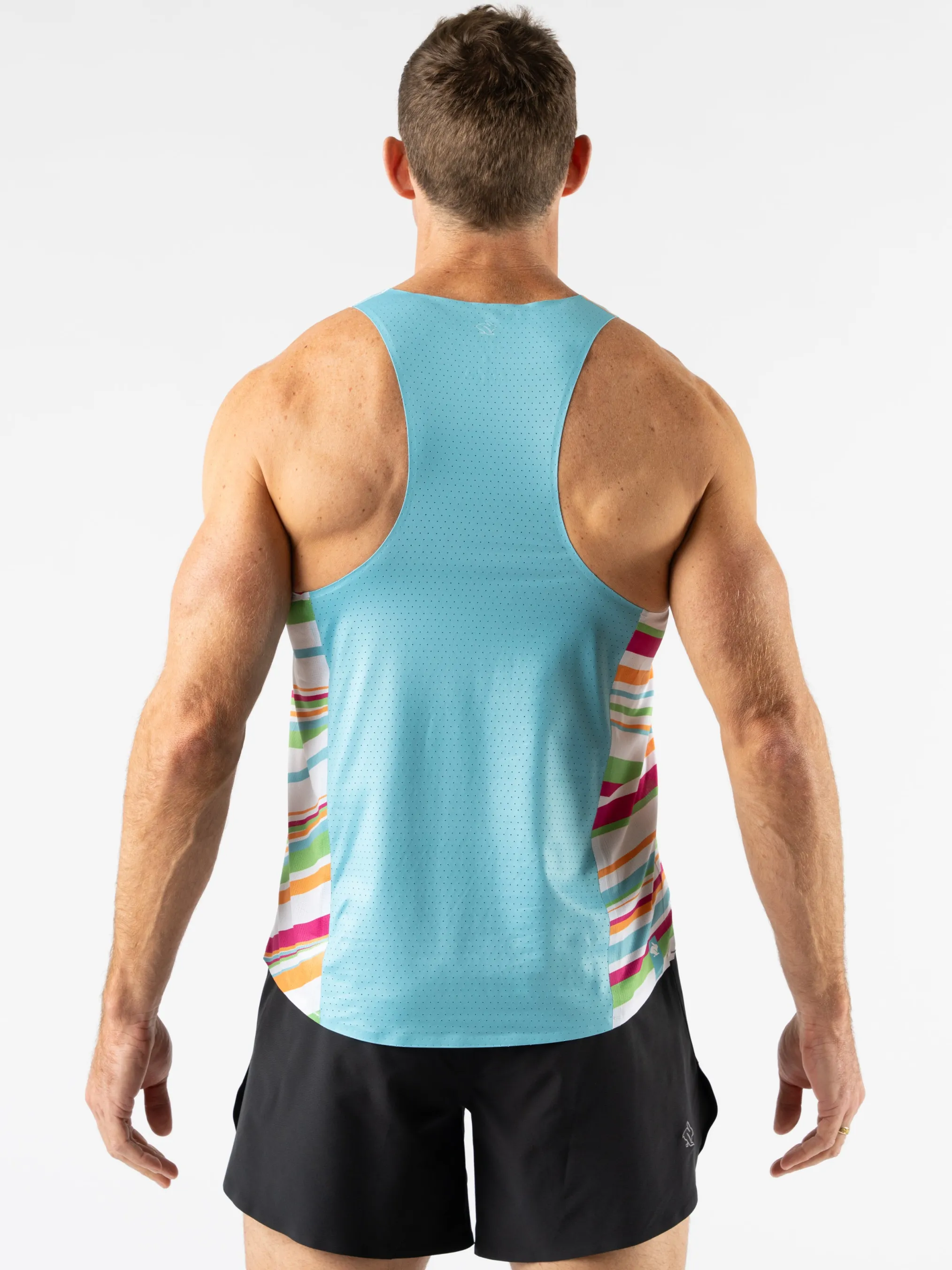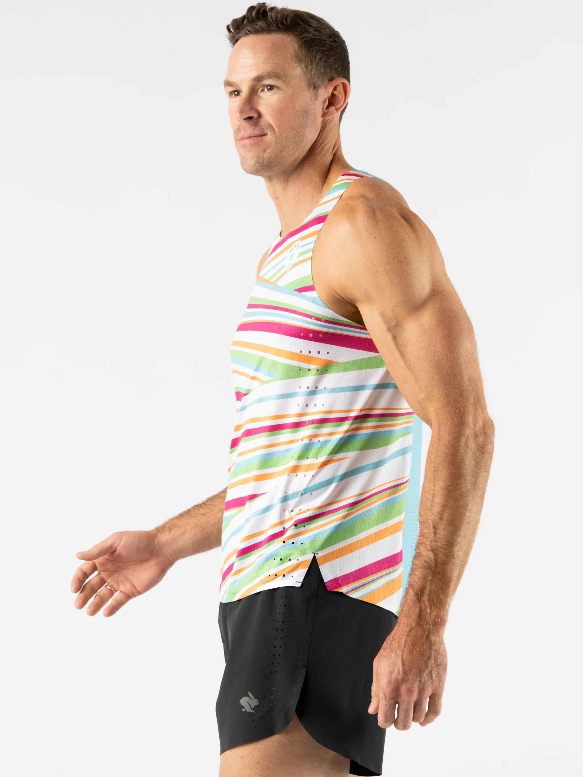 Time to shine in this technical tank. This high performance singlet provides a flattering fit with side slits at the hips, plus a refreshed perf pattern to improve ventilation. Expect ultralight fabric with bonded seams for maximum comfort with minimal weight. Set records in Tokyo.